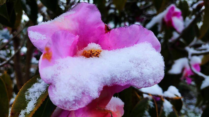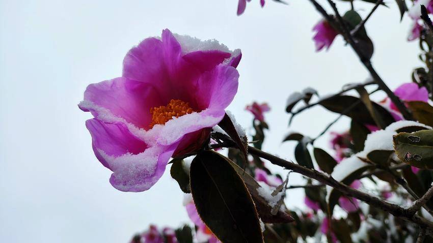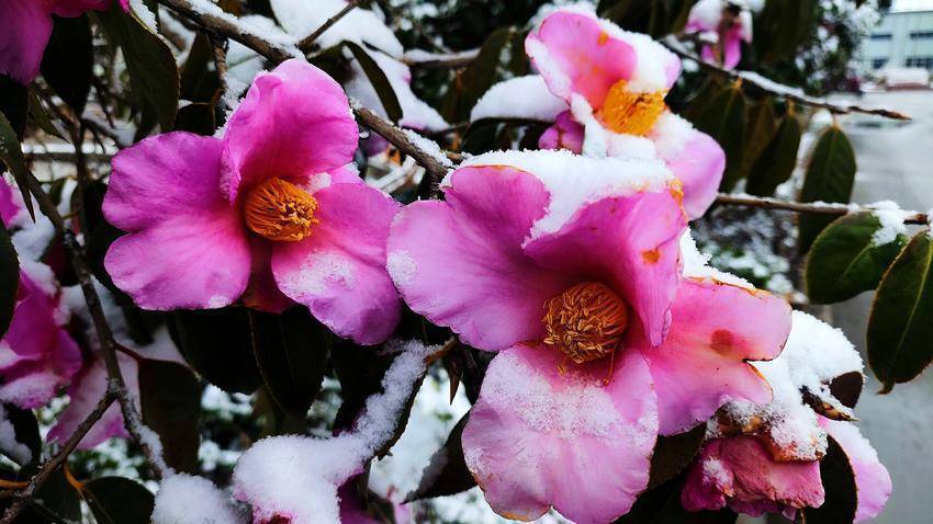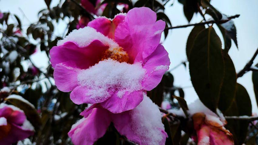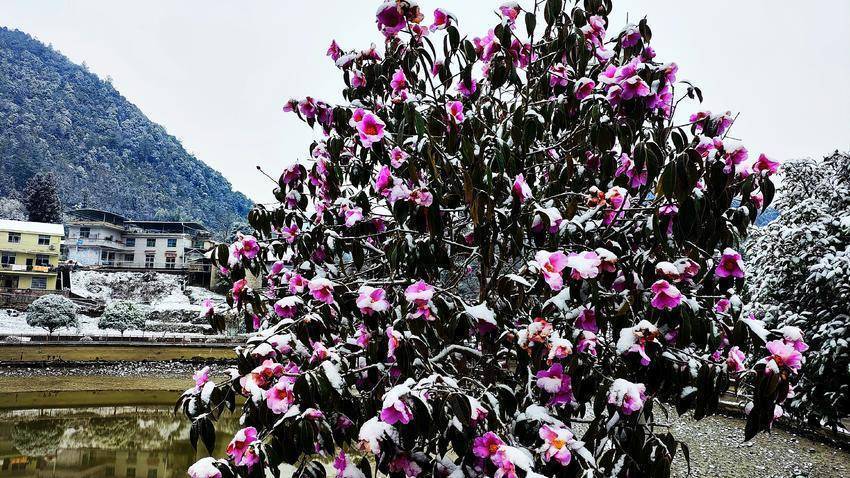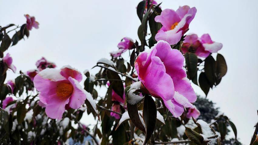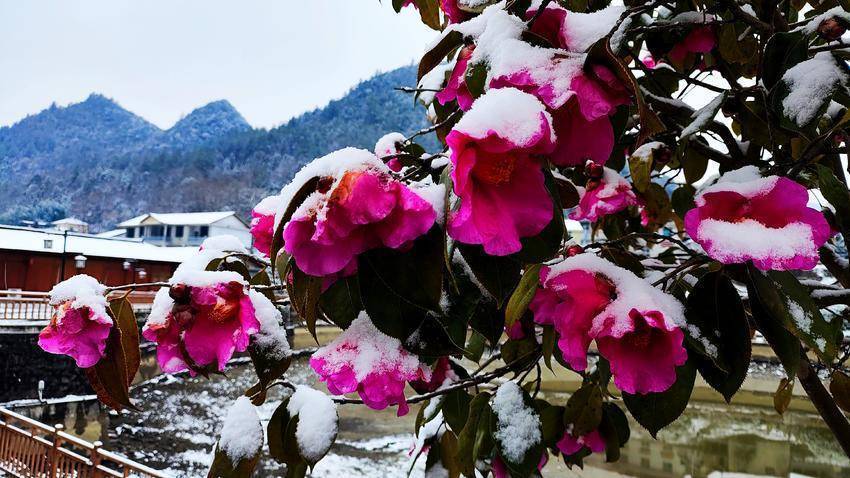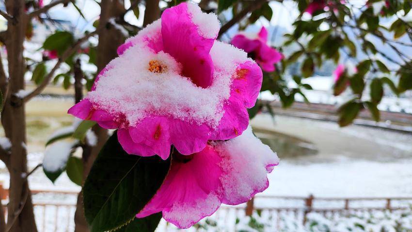 湖北日报客户端讯(通讯员杜雪平、覃春玲)腊月深冬,万木萧瑟,唯有红山茶凌寒盛放。一夜春雪悄然而至,温柔覆满枝头,白雪皑皑拥着艳艳红蕊,白似凝脂,红如胭脂,相映成绝美的冬景。