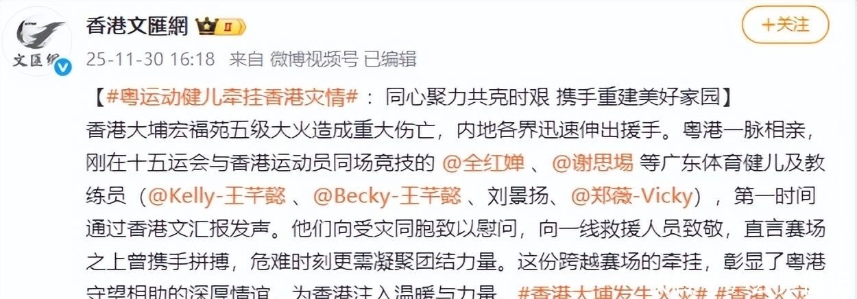 火灾发生数日后,《香港文汇网》官方社交媒体发布了一段主题为“粤运动健儿牵挂香港灾情”的慰问视频。